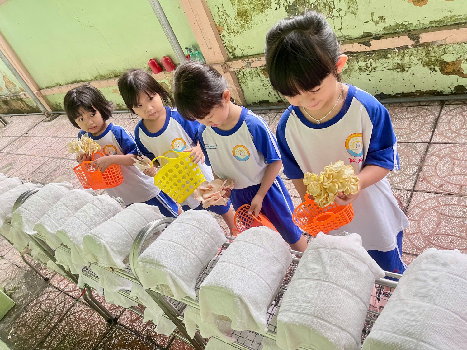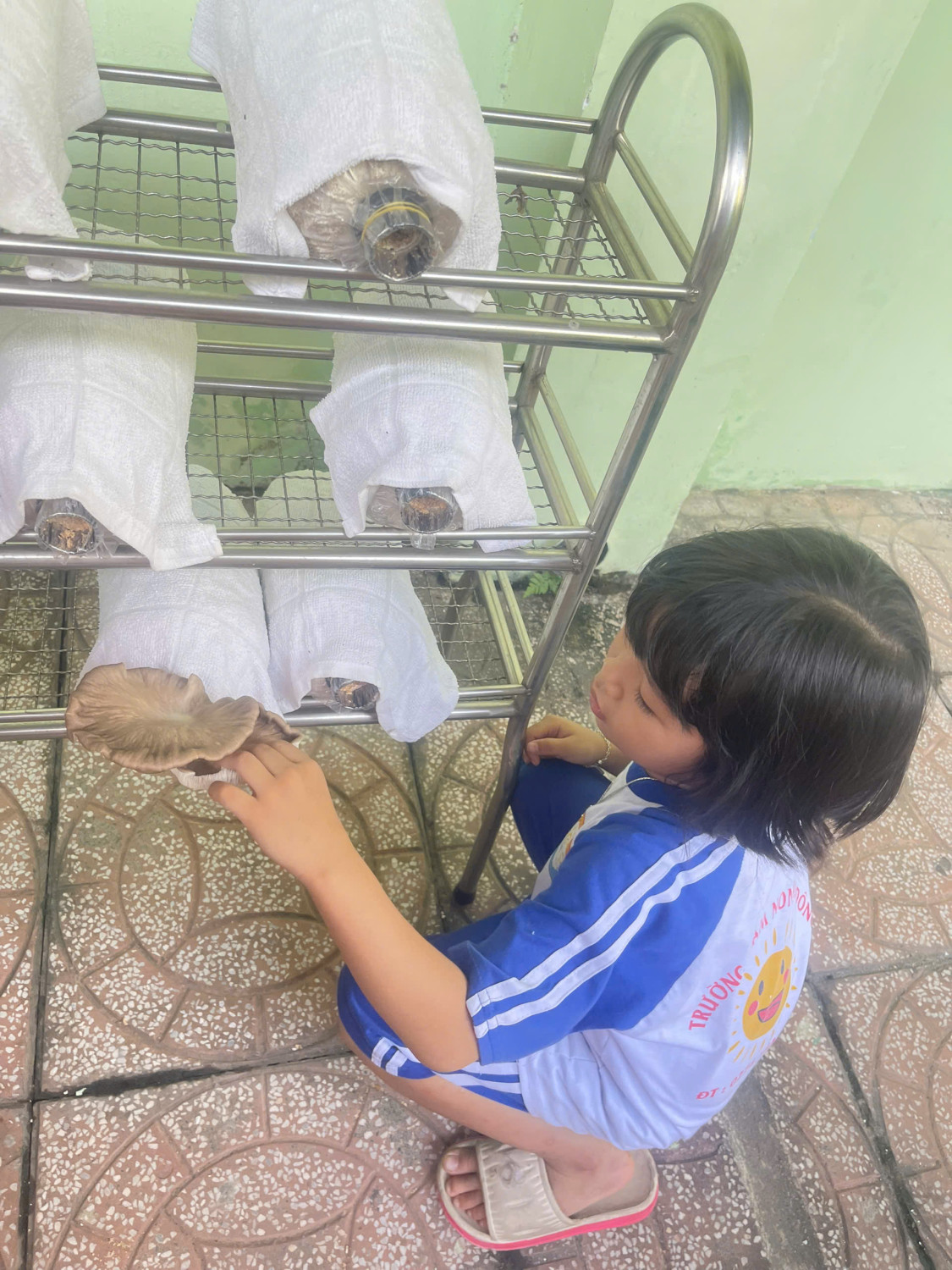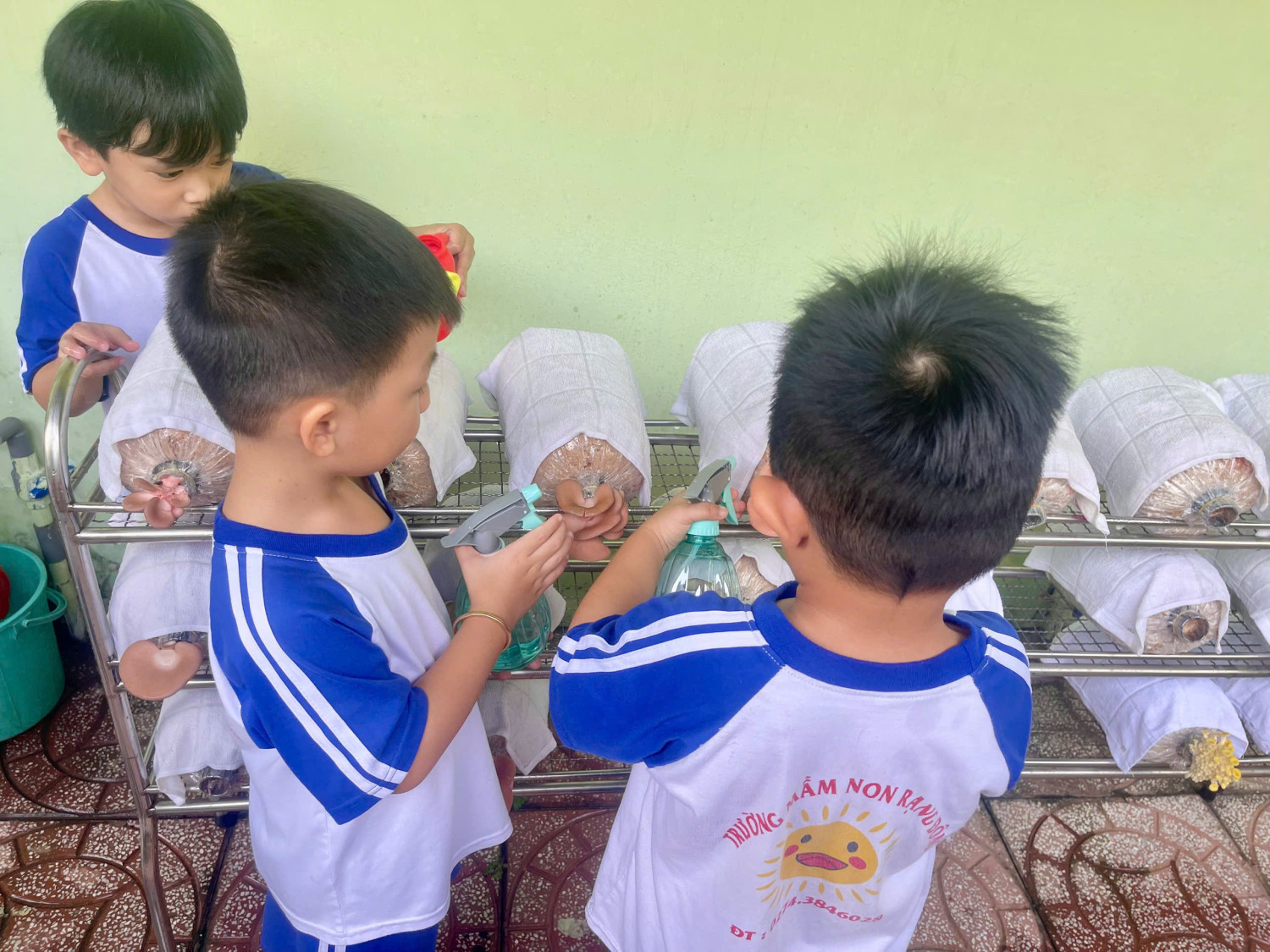 Các bé lớp Chồi 2 trãi nghiệm trồng nấm và thu hoạch nấm. Các bé tất thích thú với trãi nghiệm trồng nấm.