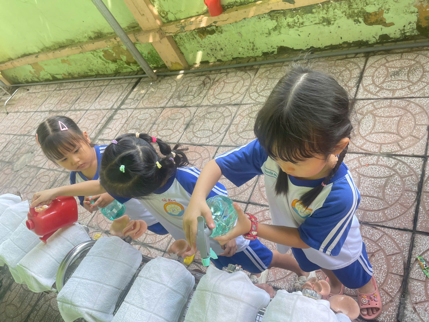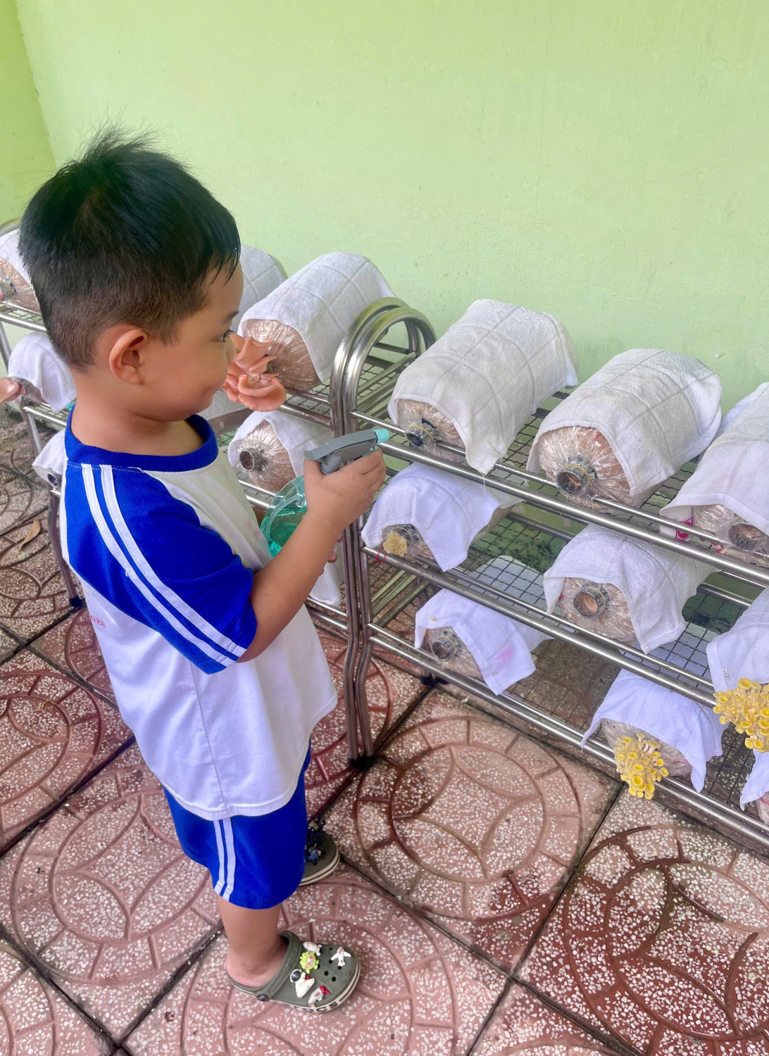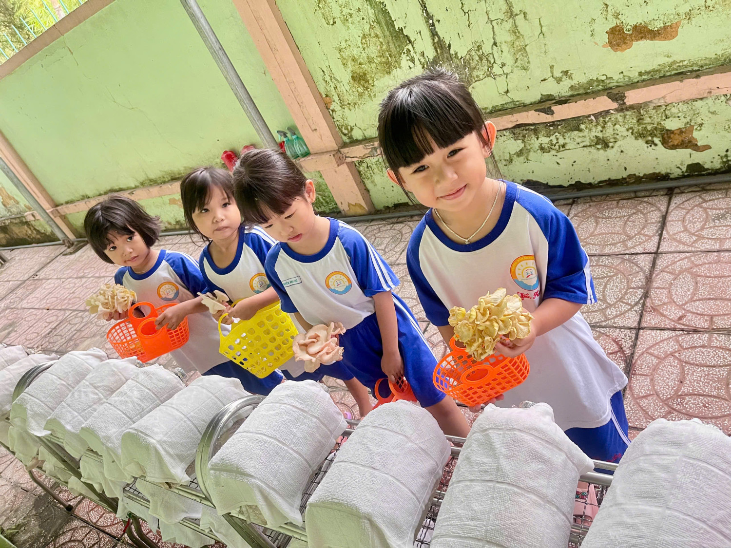 Các bé lớp Chồi 2 trãi nghiệm trồng nấm và thu hoạch nấm. Các bé tất thích thú với trãi nghiệm trồng nấm.